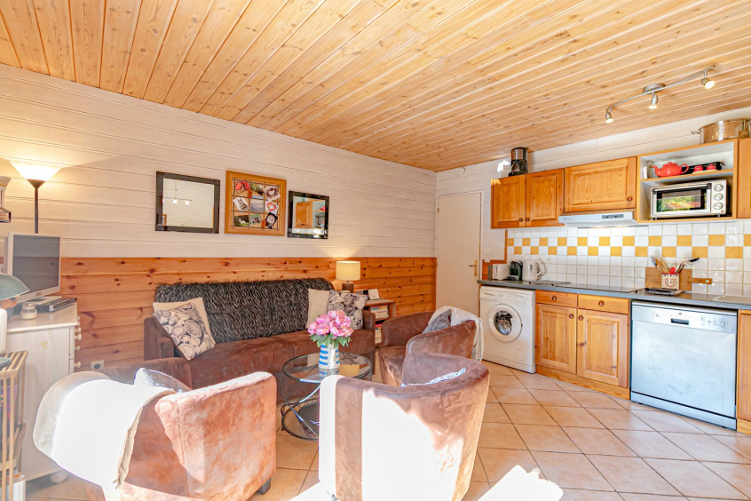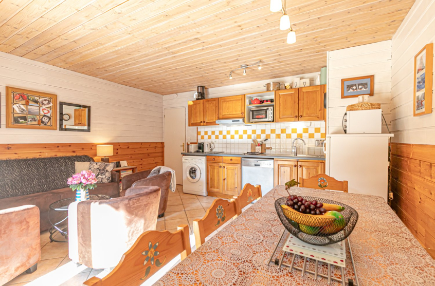 séjour avec cuisine, deux chambres et un coin montagne, deux s.d.b. Terrasse sud sèche chaussures dans le cassier de ski!
